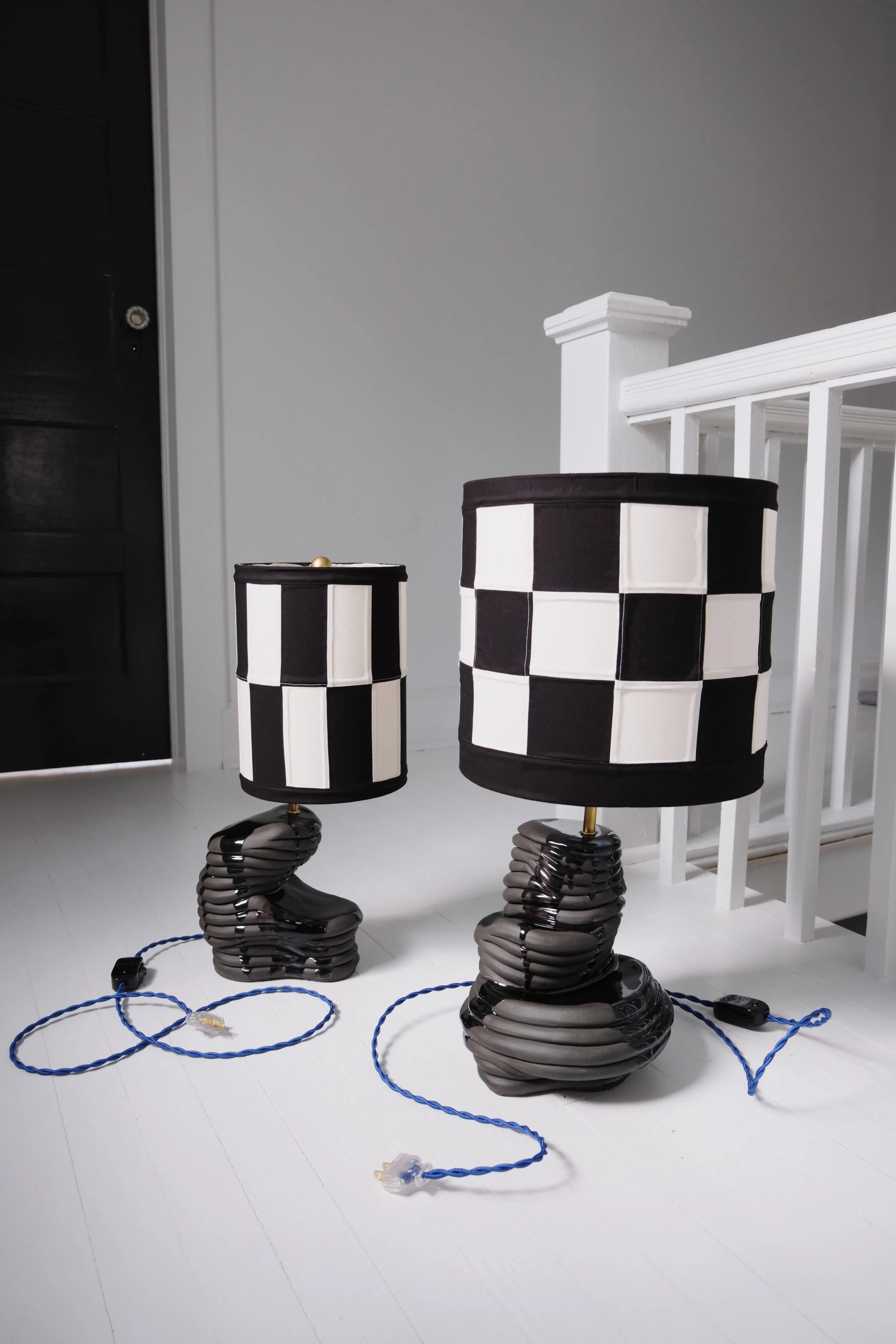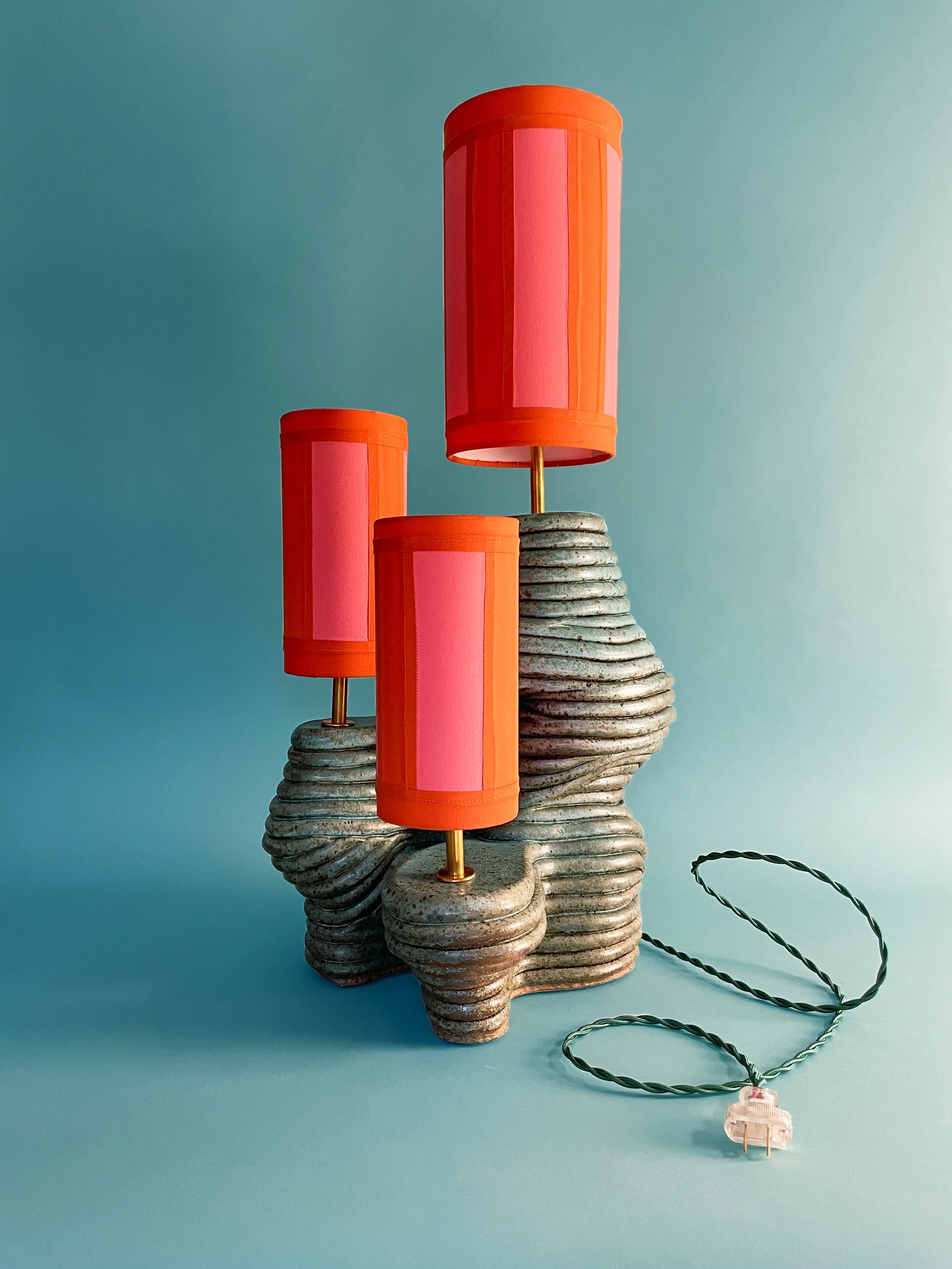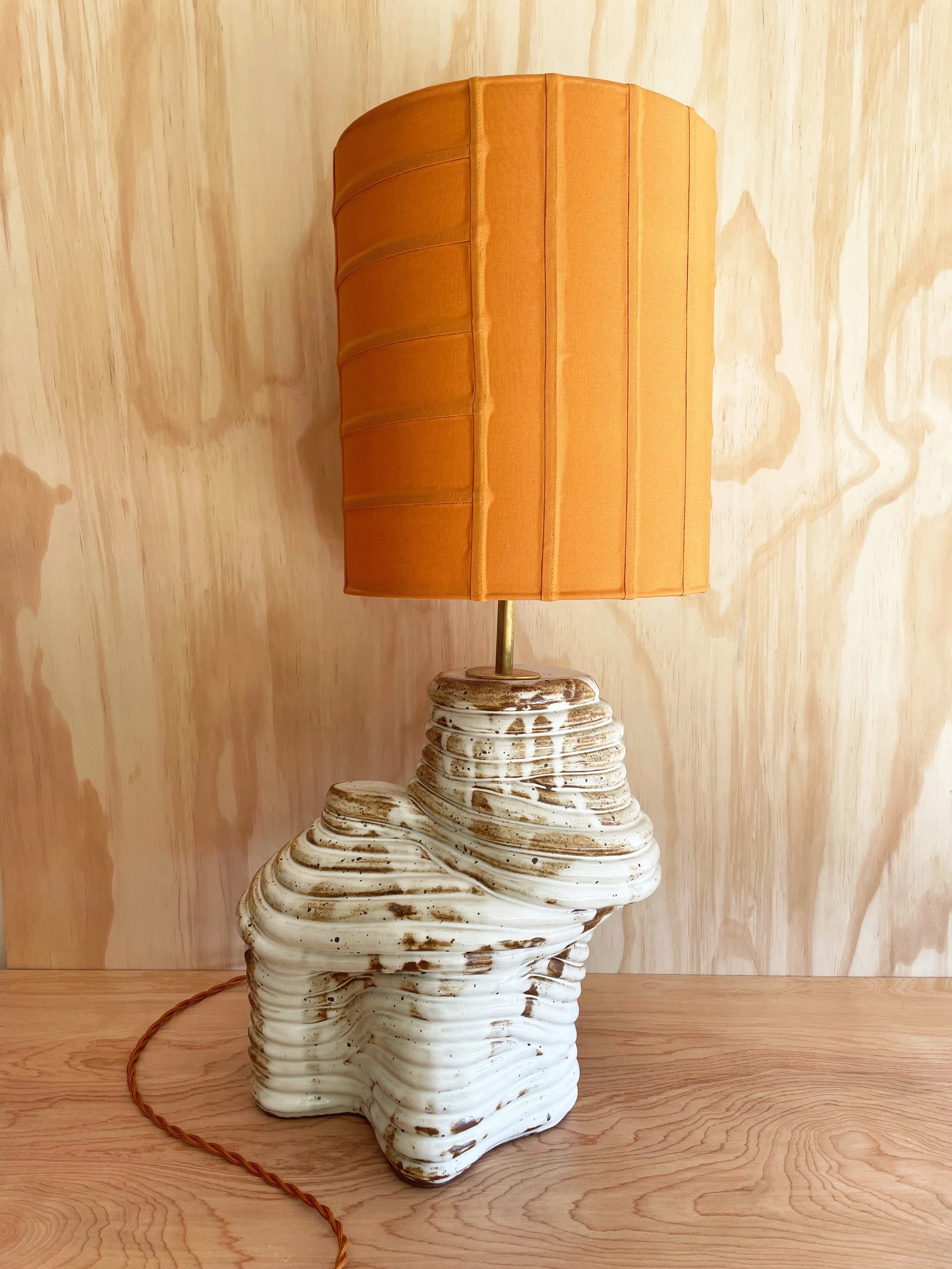 Earth Ship designs and creates custom, hand-built ceramic lamps, each one entirely one-of-a-kind. The sculptural bases are formed by hand using a coiled ceramic technique, giving every piece its own subtle variation in shape, texture, and character. Shades are crafted in-house as well, either constructed through a quilting process or finished with marbled, hand-dyed fabric.
