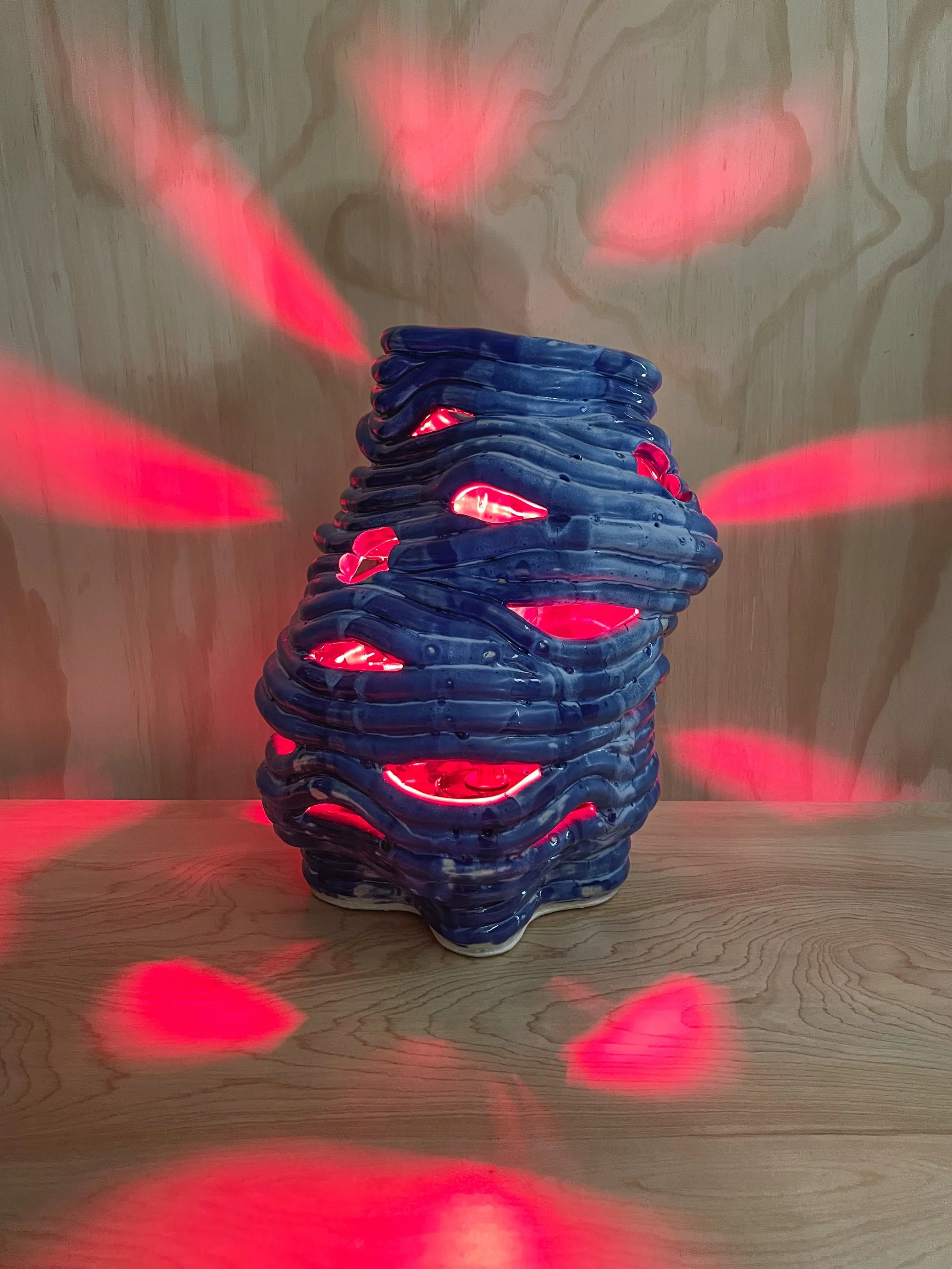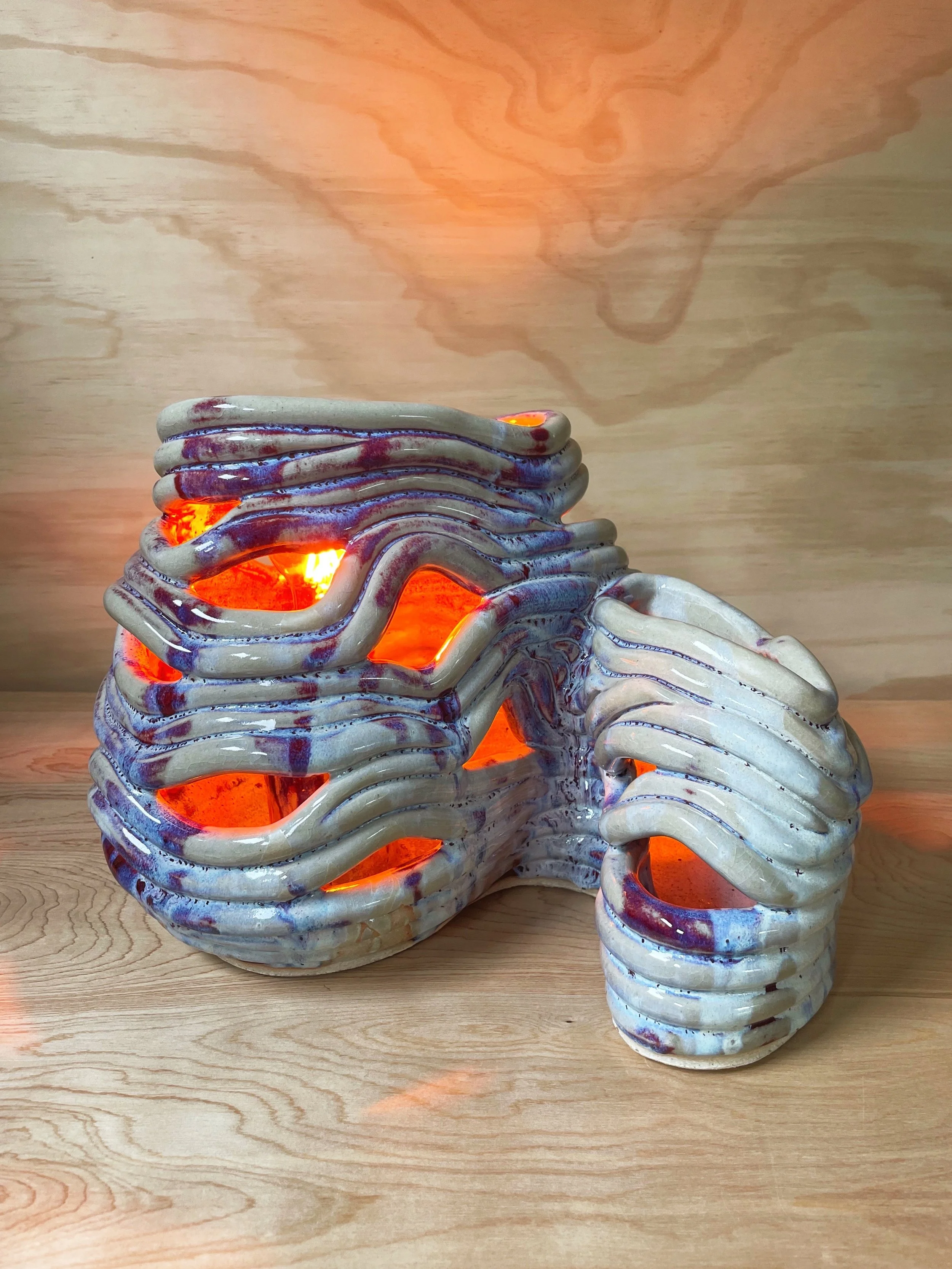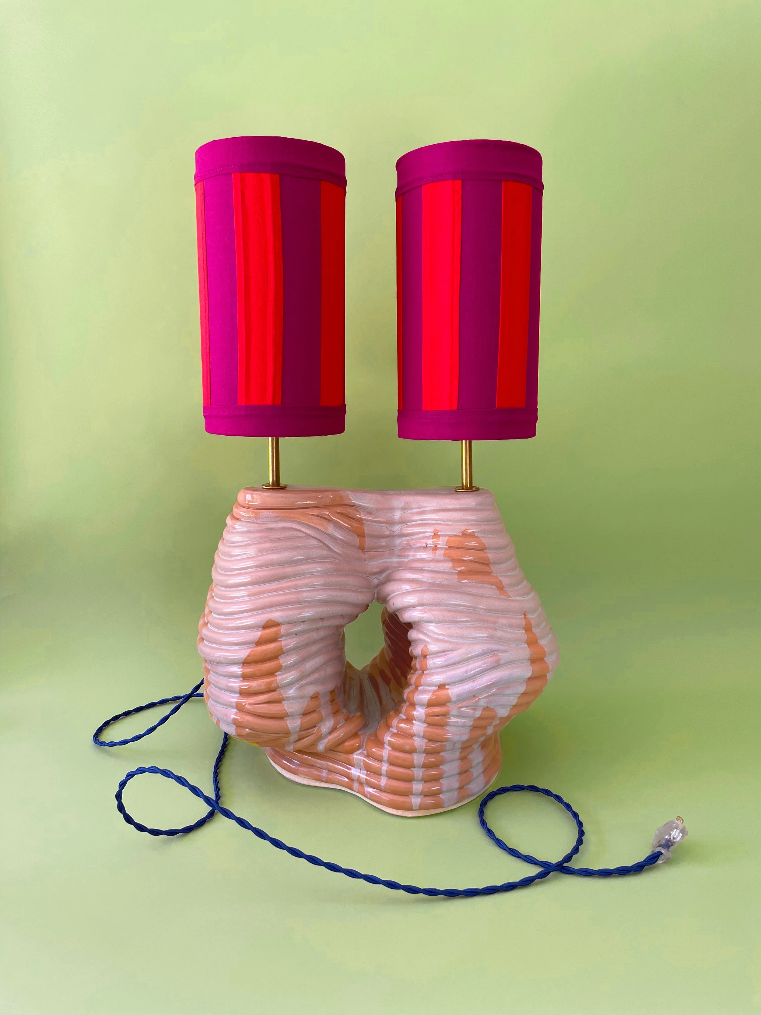 Earth Ship designs and creates custom, hand-built ceramic lamps, each one entirely one-of-a-kind. The sculptural bases are formed by hand using a coiled ceramic technique, giving every piece its own subtle variation in shape, texture, and character. Shades are crafted in-house as well, either constructed through a quilting process or finished with marbled, hand-dyed fabric.